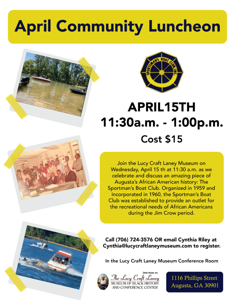 Join the Lucy Craft Laney Museum as we celebrate and discuss an amazing piece of Augusta’s African American history: The Sportsman’s Boat Club. Organized in 1959 and incorporated in 1960, the Sportsman’s Boat Club was established to provide an outlet for the recreational needs of African Americans during the Jim Crow era.